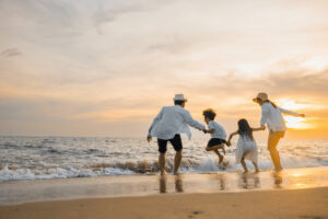 Happy family have fun jumping on beach in holiday at sunset
