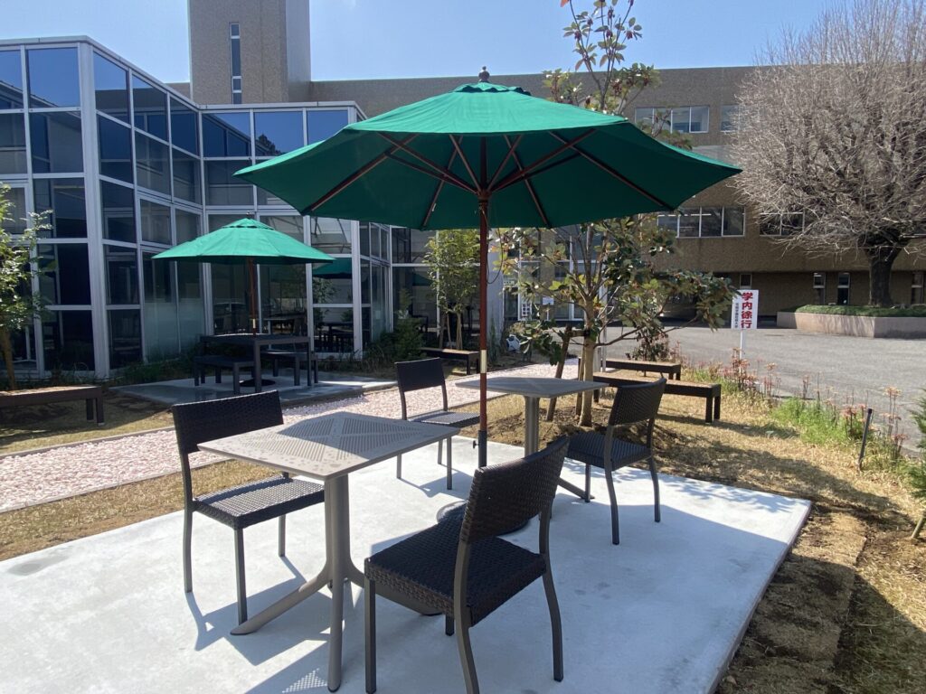 直射日光をやわらかく遮りながらも開放感を確保し、キャンパス内にいながらカフェのようにくつろげる空間を