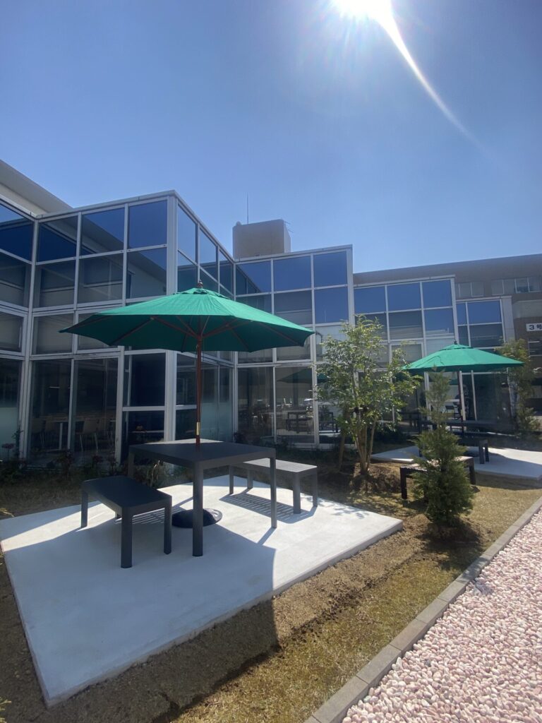 パラソルを設置することで日差しをやわらげ、休憩やコミュニケーションの場として活用できる空間に。